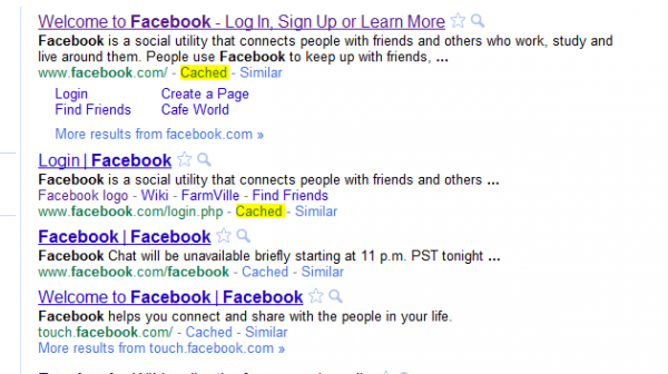 Now, open Google in your browser (an office or school will never block Google or if it does, then skip to the next step) and search for Facebook or anything relevant to that. The Search listing will show Facebook, now click on Cached link and the page will open the cached form of the page(see screenshot).